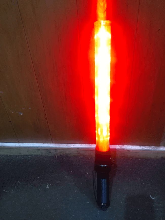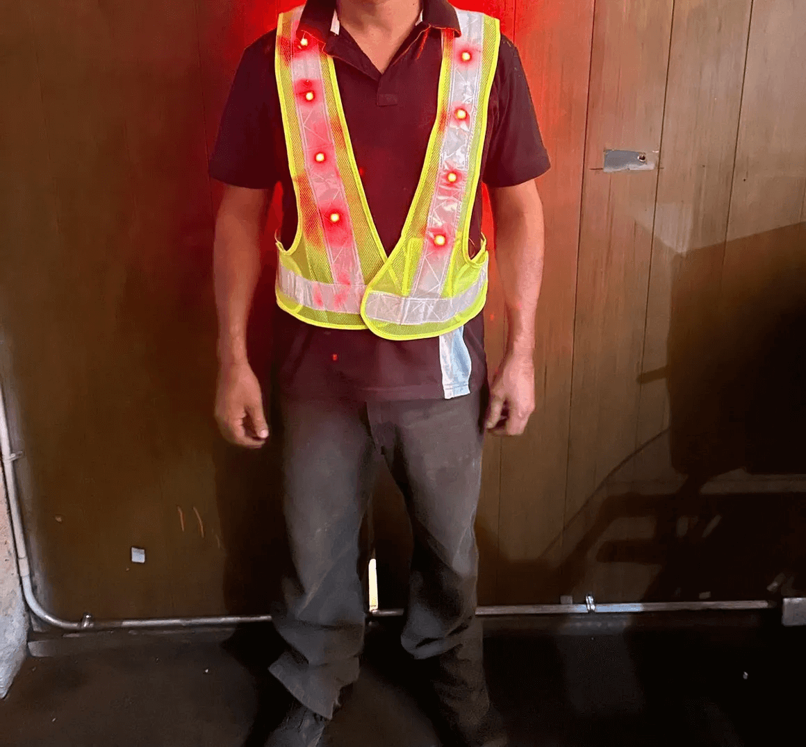 Muñeco banderero solar, dispositivo con luz intermitente ideal para advertencia visual en entornos de baja visibilidad y control de tránsito en obras.